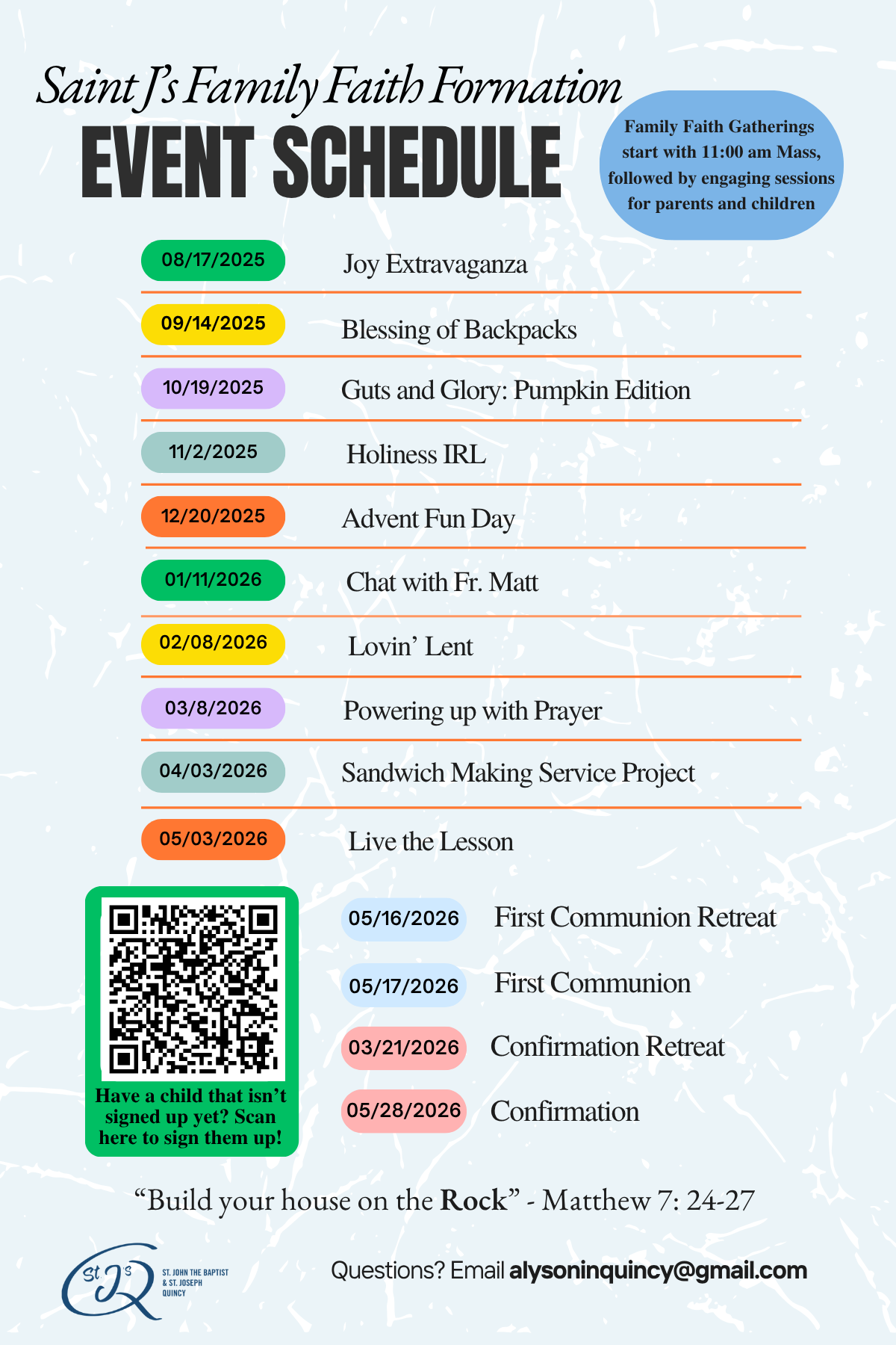 At Saint J's, it is both a blessing and a joy to be part of such a vibrant and faith-filled community. That joy deepens with the Faith Formation where we walk alongside children and families together through our Catholic faith.