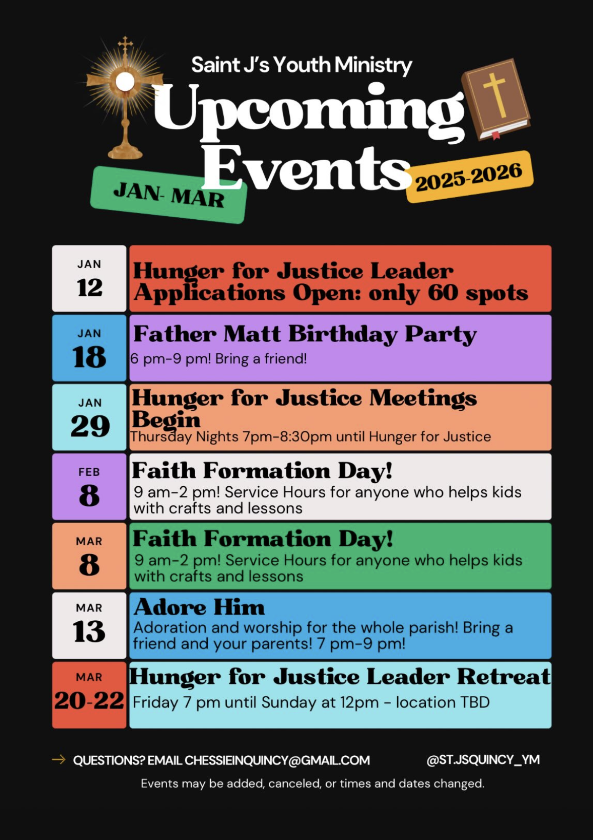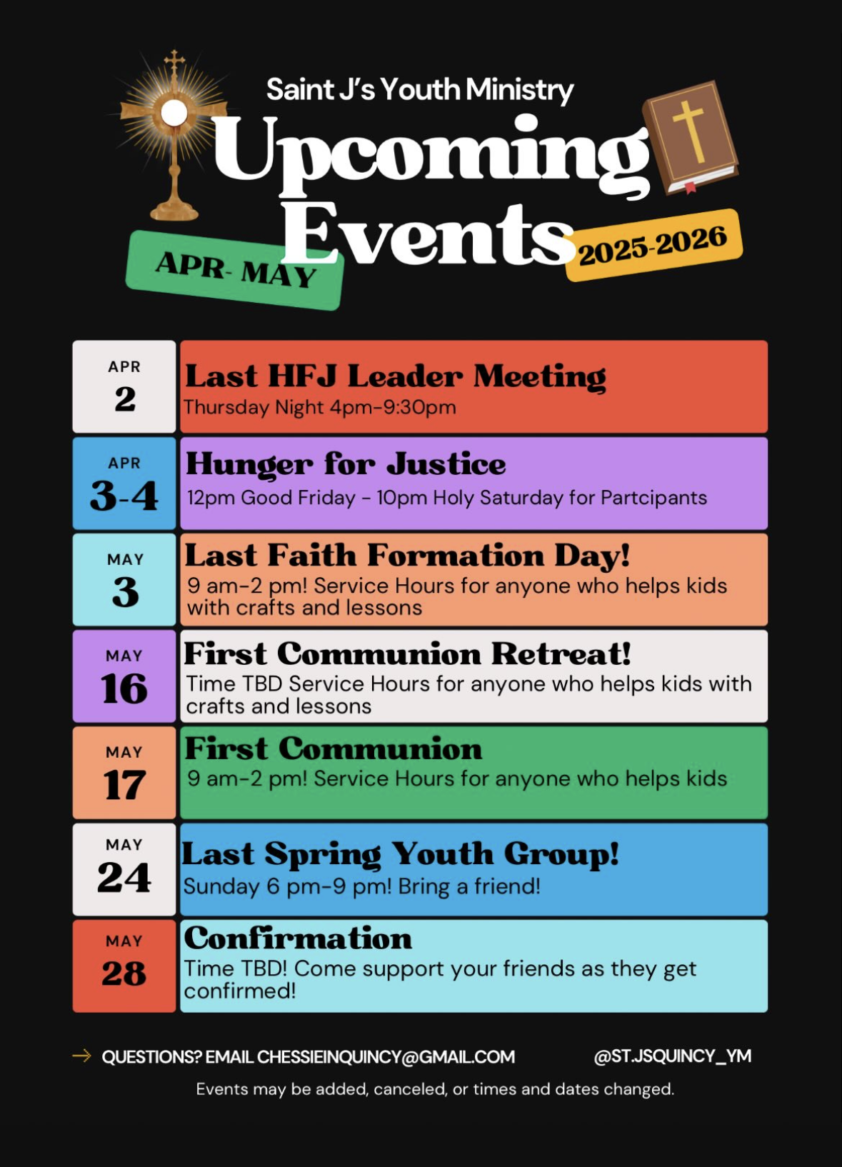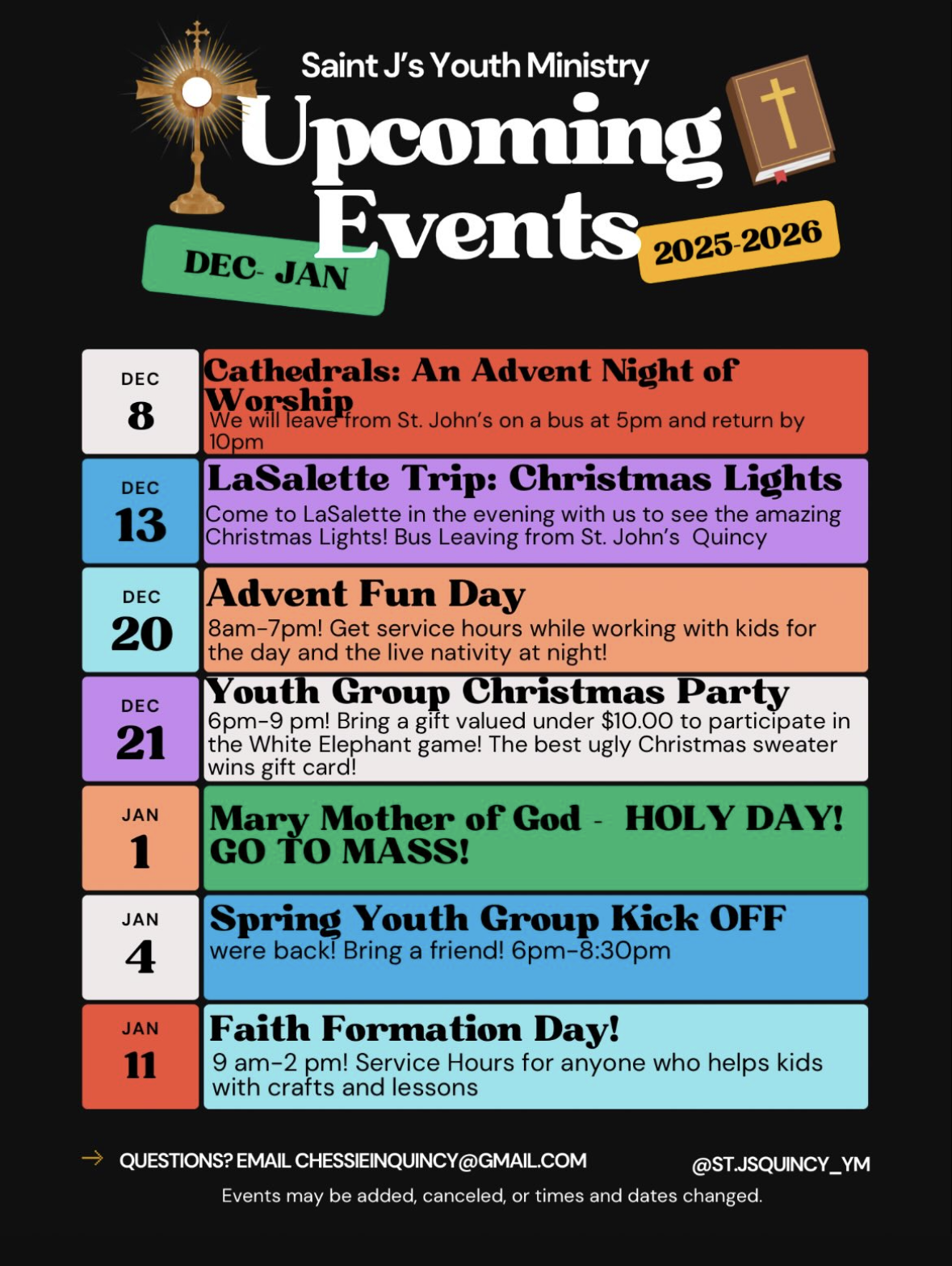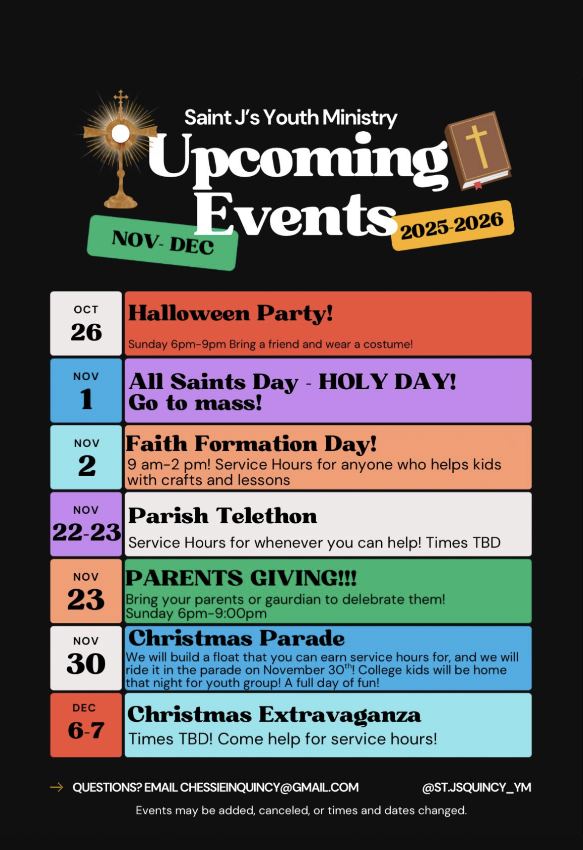 Youth group has been the foundation of our teens community. They gather weekly in our lower church after the 5pm mass until 8:30pm every Sunday. You are welcome! Check out all our events below: